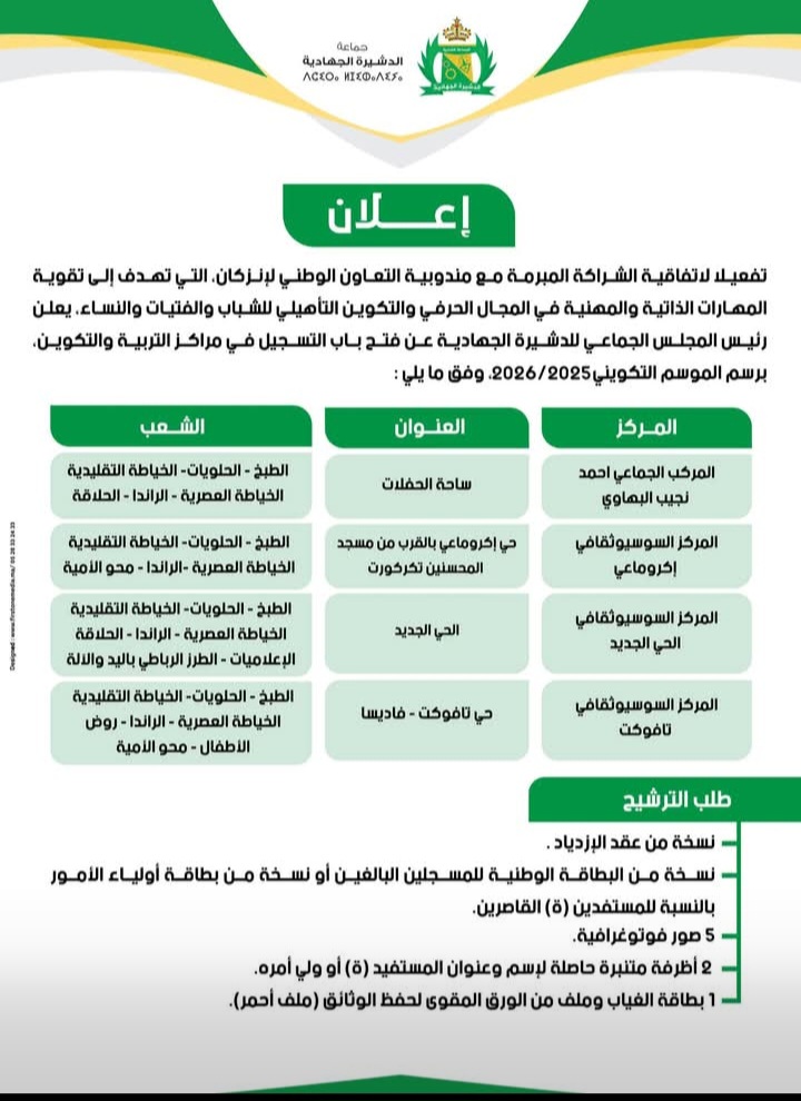 يثير إلزام المستفيدين من التكوينات داخل المراكز السوسيوثقافية بالدشيرة الجهادية موجة غضب واستياء مشروعين، خاصة وأن هذه الفضاءات أُحدثت من المال العام، وكان من المفترض أن تكون أدوات للإدماج الاجتماعي ومحاربة الهشاشة، لا عبئًا إضافيًا على كاهل الشباب والنساء الباحثين عن فرصة للتأهيل والكرامة.