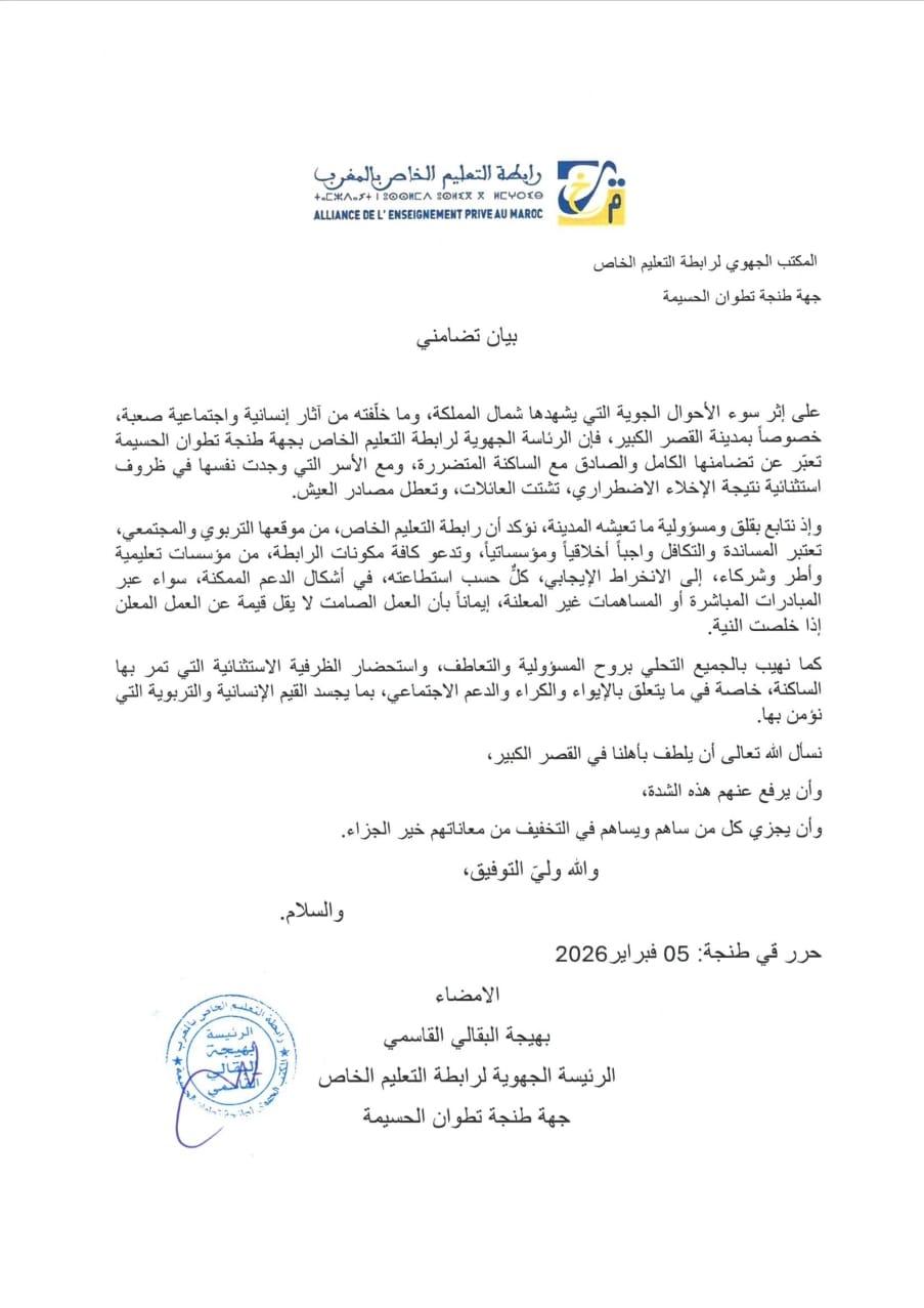 أعلنت رابطة التعليم الخاص تضامنها الكامل مع الأسر والمؤسسات التعليمية المتضررة من الفيضانات الأخيرة، مؤكدةً وقوفها إلى جانب الطلبة والمعلمين والإداريين الذين تأثروا بهذه الظروف الاستثنائية.
